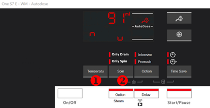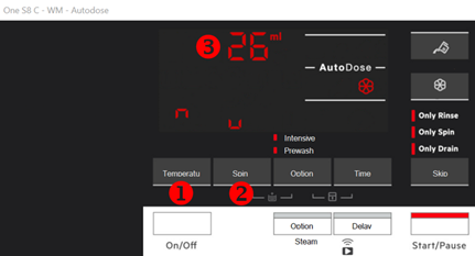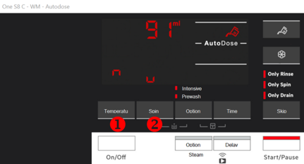 11. Pour régler le dosage de base, appuyez plusieurs fois sur le bouton Température (1) pour régler le dosage vers le haut et le bouton Essorage (2) pour le régler vers le bas. Le pas minimum est de 1 ml.