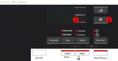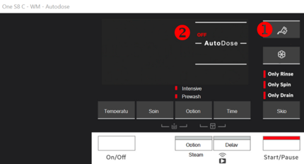 2. Appuyez sur le bouton du réservoir de détergent (1). L'écran affiche OFF (2).