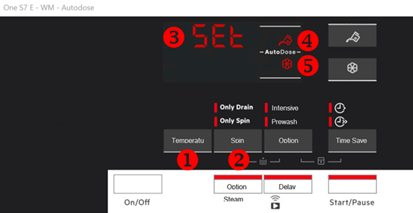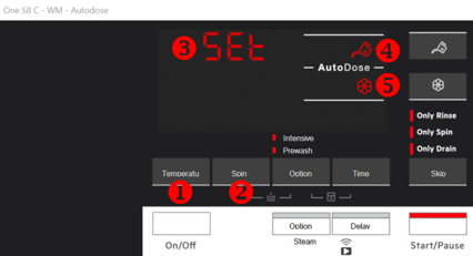 1. Pour entrer en mode configuration, maintenez enfoncés simultanément les boutons Température (1) et Essorage (2) pendant quelques secondes jusqu'à ce que l'écran affiche «SET» (3) sur la gauche de l'écran et le réservoir de détergent clignotant (4) et les voyants du réservoir d'adoucisseur (5) sur la droite de l'écran.