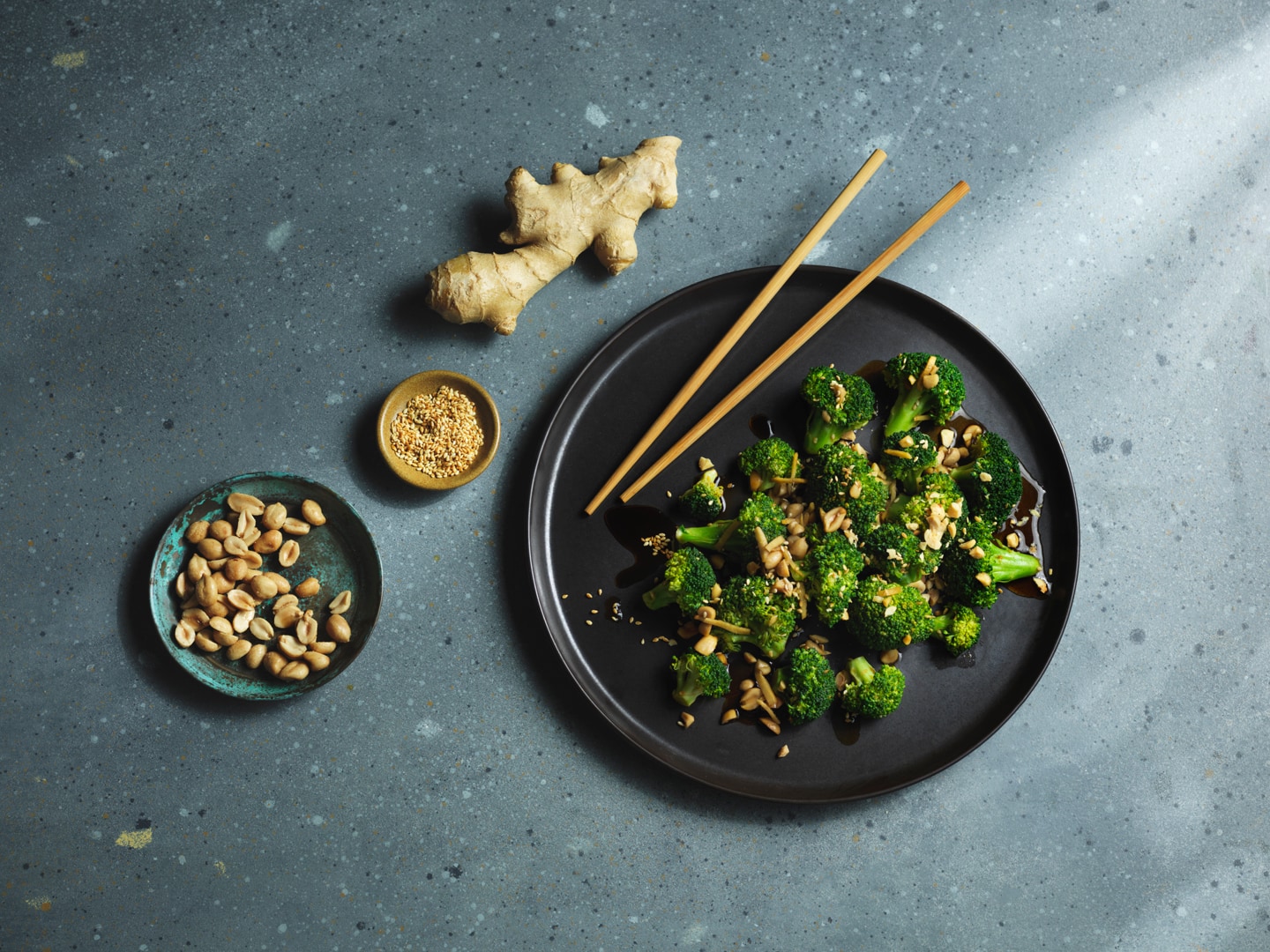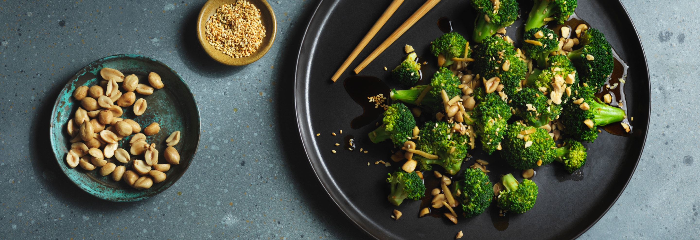 Brocolis au gingembre, à la sauce soja, aux cacahuètes et graines de sésame