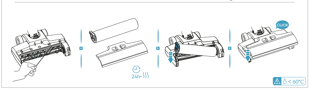 8. Replacez dans leur position initiale le rouleau puis le couvercle de la brosse jusqu'à entendre un bruit d'enclenchement ("click").