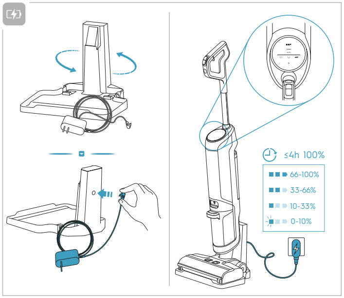 3. Placez l'aspirateur entièrement assemblé sur le support de charge. Branchez le câble d'alimentation à la prise et attendez la charge complète (environ 4 heures) avant d'utiliser l'appareil.