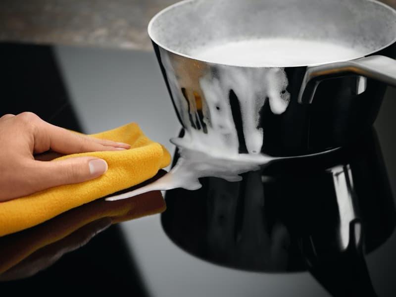 Lorsque la table de cuisson est froide, nettoyez les anneaux de calcaire, les anneaux d'eau ou les taches de graisse avec un chiffon humide et un nettoyant pour table vitrocéramique non abrasif. La décoloration métallique brillante peut être éliminée de la surface noire avec une solution d'eau et de vinaigre et un chiffon doux.